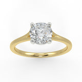 The ECO 29 custom-made 4 claw round brilliant cut diamond solitaire ring epitomises timeless elegance and sophistication. At its centre lies a breathtaking round brilliant cut diamond, securely held by a classic 4 claw setting that maximises its sparkle and brilliance. The band, featuring a split design at the setting with a width of 1.9mm, adds a modern twist to this iconic piece while providing a comfortable fit.
